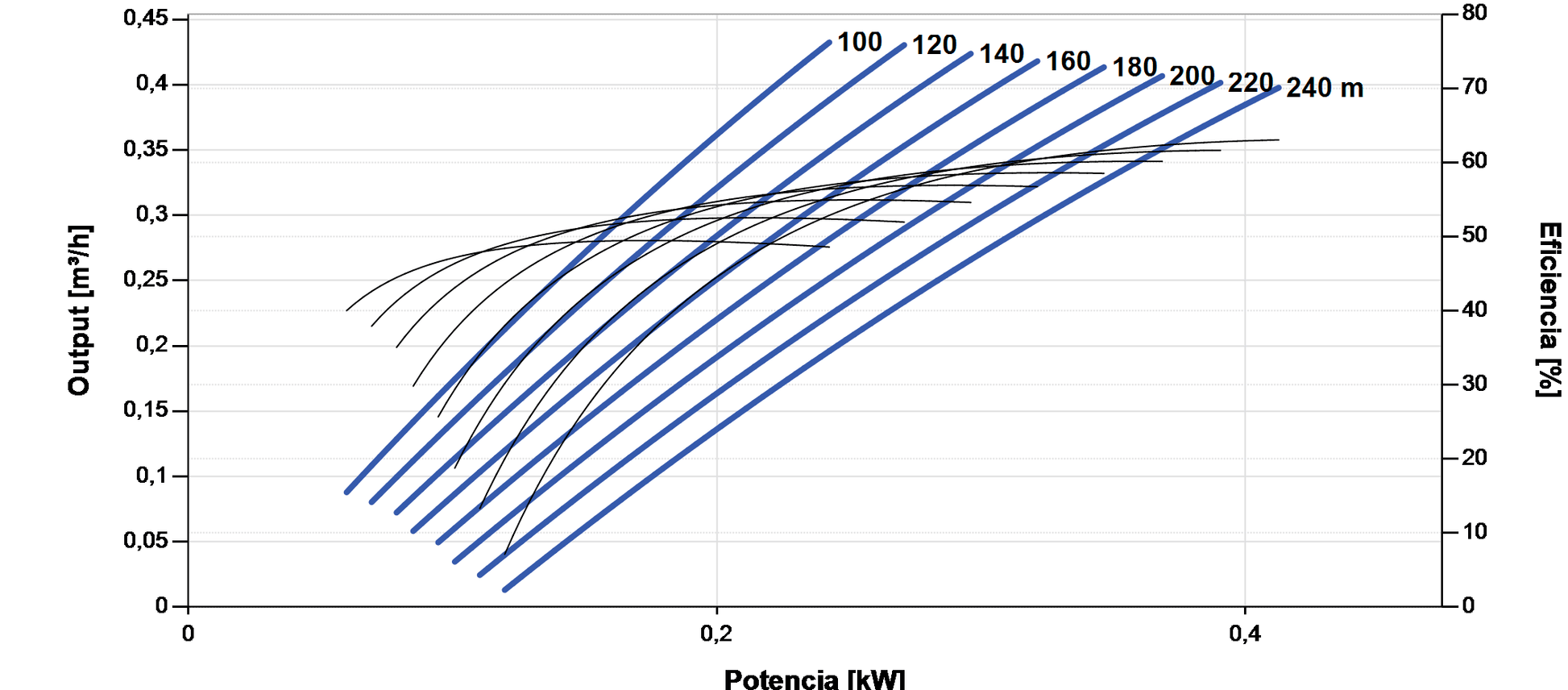 - Altura máxima 240 m y caudal máximo 0,43 m³/h (gran elevación con caudal controlado).