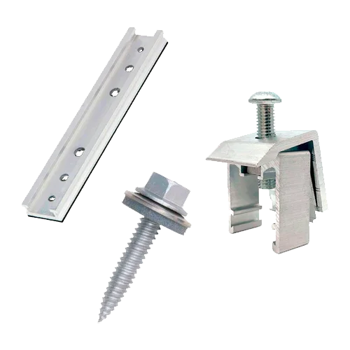 Grapas finales e intermedias 30/35 mm, clips de puesta a tierra por módulo, pasacables y bridas UV. Usar siempre cinta/aros EPDM bajo cada fijación a la chapa y verificar la continuidad equipotencial de la fila.